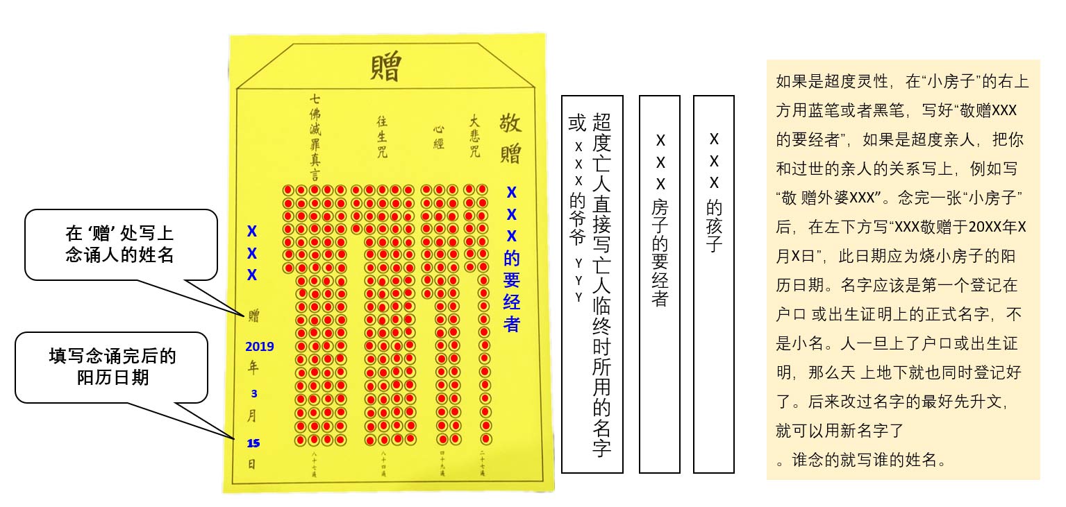 建议亲临共修会让义工们解说以便更了解如何念诵, 填写以及烧送小房子.